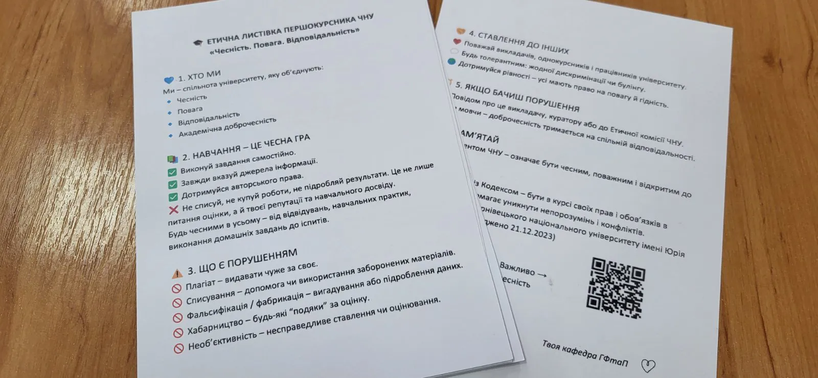28 листопада 2025 року наші першокурсники мали дуже корисну зустріч: говорили про те, що робить навчання чесним, комфортним і поважним для всіх. Разом розібрали Етичну листівку першокурсника ЧНУ та поговорили про важливі принципи, на яких ґрунтується студентське життя: чесність, повага, відповідальність.